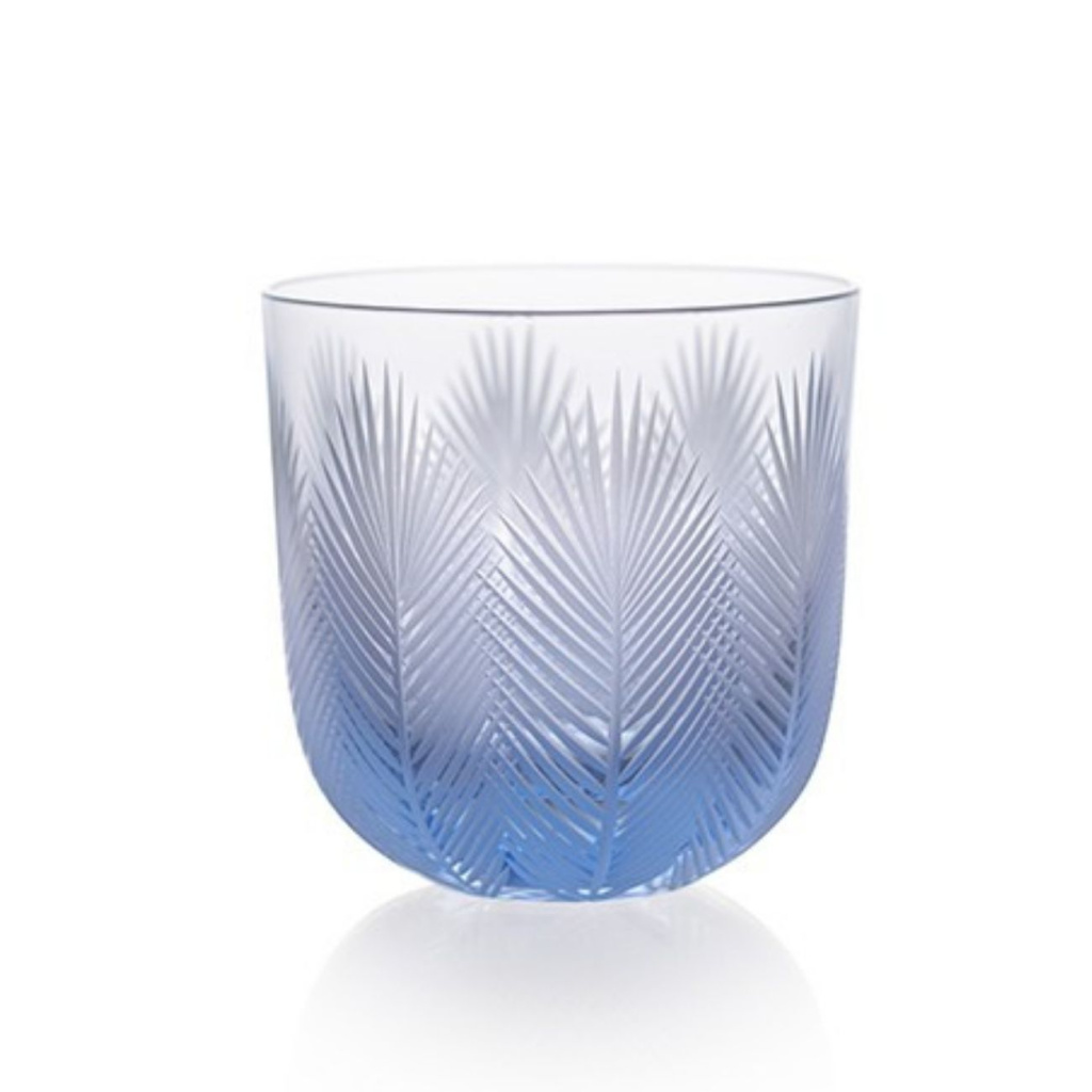 Ručně broušená sklenice s pírky z kolekce Pink od Ronyho Plesla vznikla ve sklárně Rückl jako propojení ikonického designu s tradicí českého skla. Jemný dekor připomínající zmrzlý vzor na skle je rafinovaným kontrapunktem k intenzivní modré barvě křišťálu.