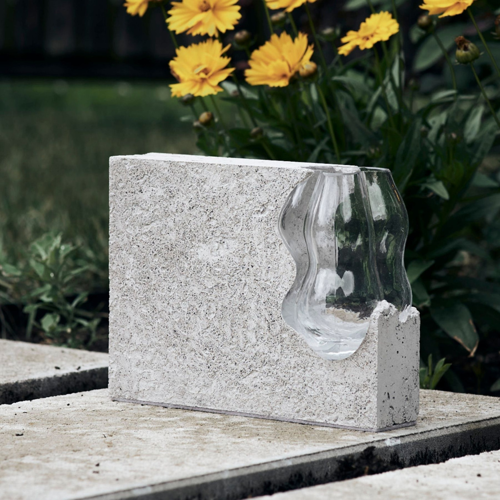 Váza Vlnkova je autorský objekt od Petry Švejdarové a designové značky PRASKLO. Vychází z rukodělného spojení upcyklovaného skla a architektonicky působícího betonu, tentokrát ve tvaru evokujícím jemný pohyb či vlnu.