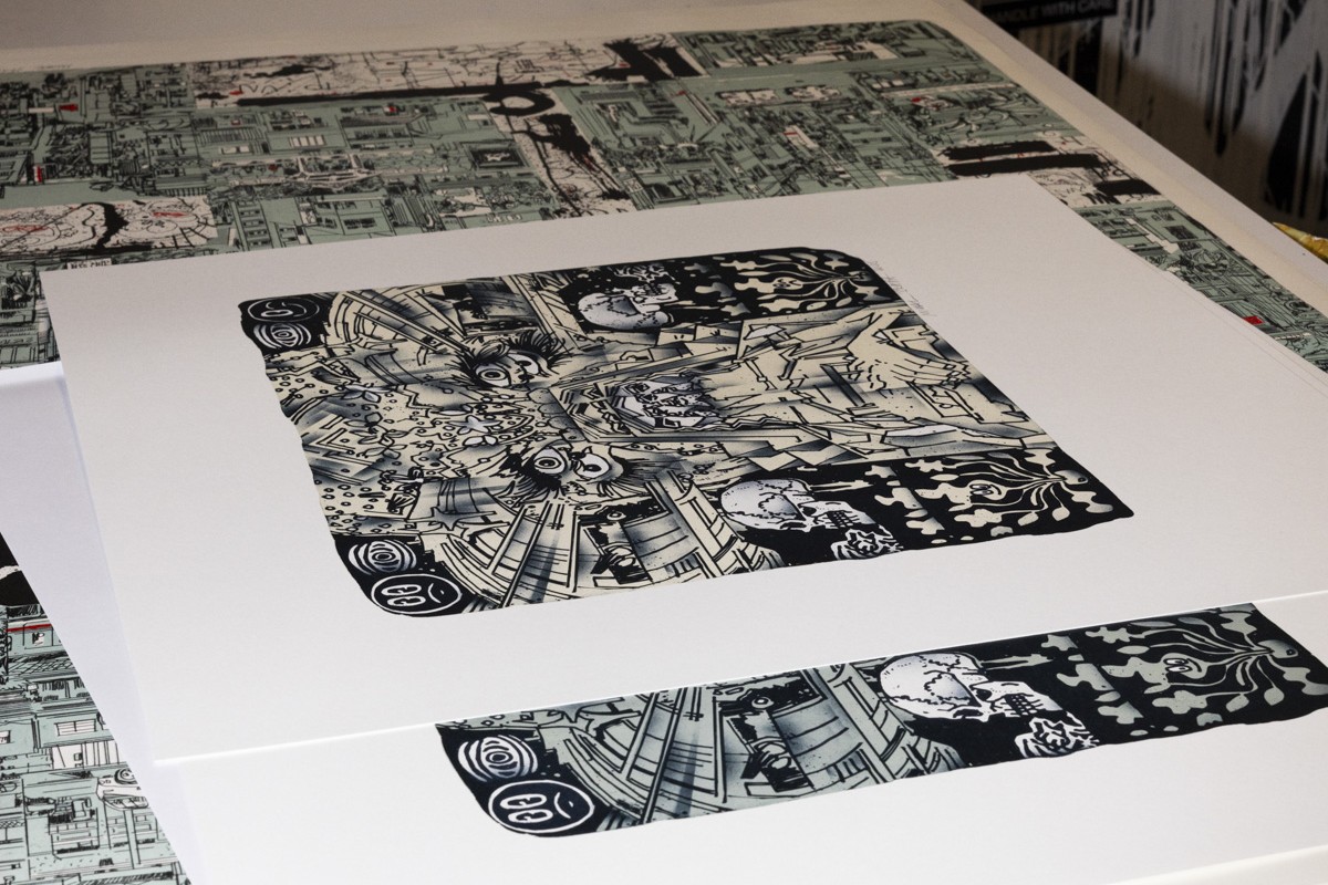I grew up in Prague, and viewing the city through graffiti, exploring hidden corners and alleyways as part of that subculture, has had a big influence on me. It’s something that continues to shape my work today. The city structure in the larger print follows my long-term creative line, where I depict urban formations and landscapes, often in a collage-like way. I was inspired by my trip to Japan this spring. I spent time in Tokyo’s Akihabara district, known for its chaotic development. It’s a real melting pot, famous for its abundance of electronics shops and as a haven for video game and anime enthusiasts. While I was there, and throughout Tokyo, I took a lot of photographs. As with many of my projects, I draw from my own documentation — carefully selecting and collaging it and then transferring it onto the stone.
