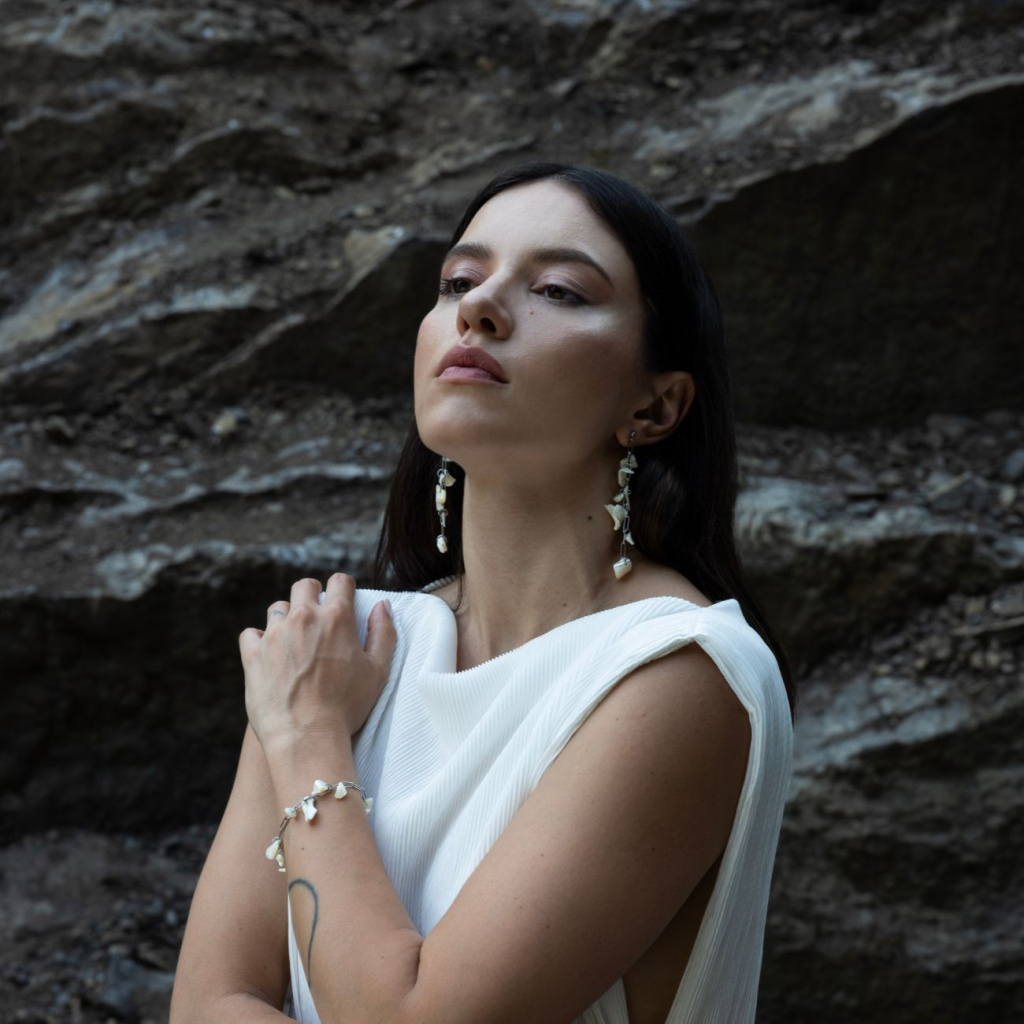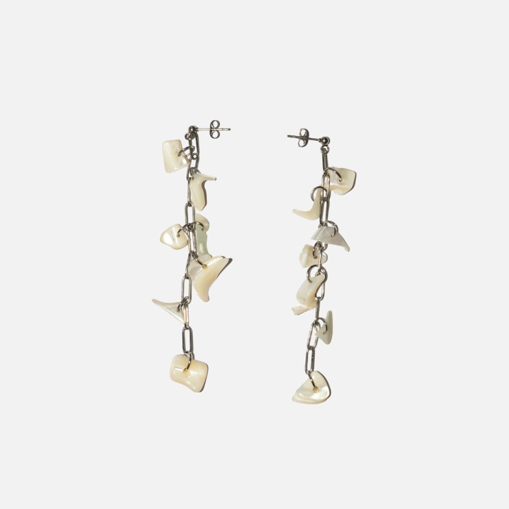 The EBISU EARRINGS capture the organic rhythm of the sea through scattered vintage mother-of-pearl fragments suspended from a fine stainless steel chain. Their sculptural, flowing form reflects light with every movement, resembling delicate underwater vegetation. Designed and handmade in Prague by Klára Dudáková, founder of Kaaret, these earrings embody the brand’s slow design philosophy – giving new life to pre-existing materials while maintaining authenticity and care for craftsmanship. Each pair is unique in shape and tone due to the natural origin of the mother-of-pearl, creating subtle variations that emphasize individuality and material poetry.