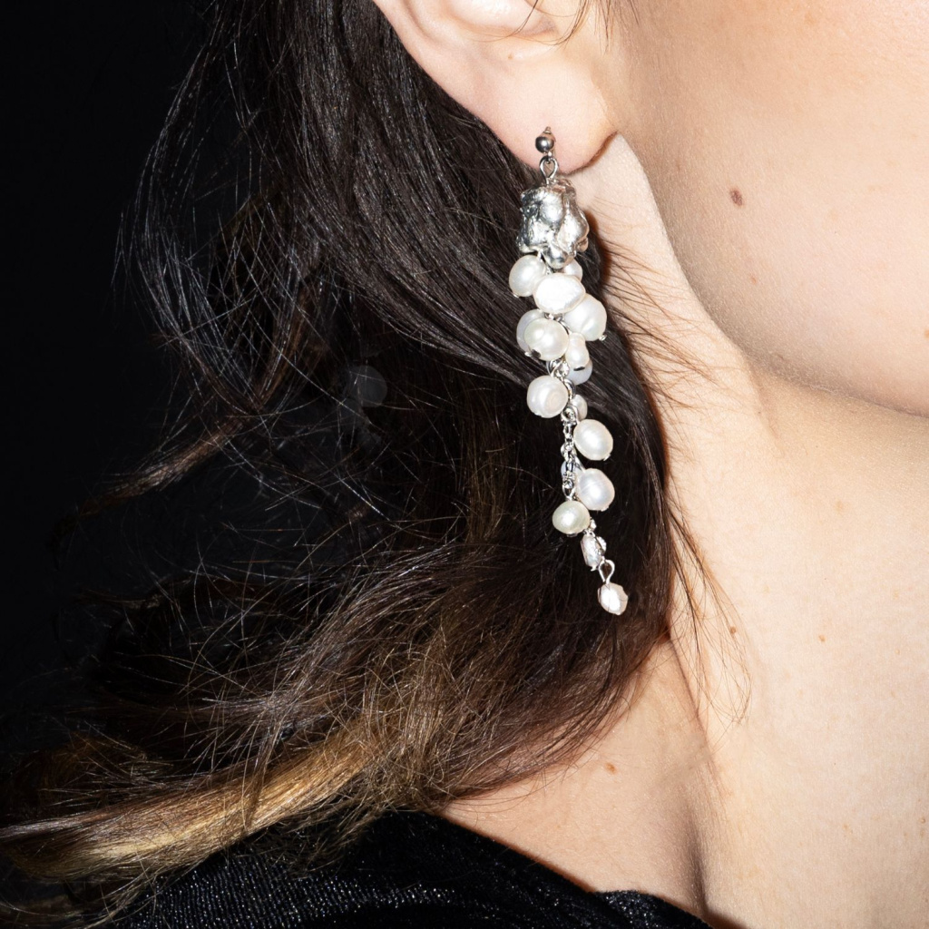 Casace earrings from Kaaret’s ENCASE collection feature vintage and secondhand freshwater pearls intertwined with hand-shaped metal components made using a soft soldering technique (tin–copper–silver). The molten, organic structure evokes dripping mud and natural sediment, giving each piece a sculptural, raw elegance.