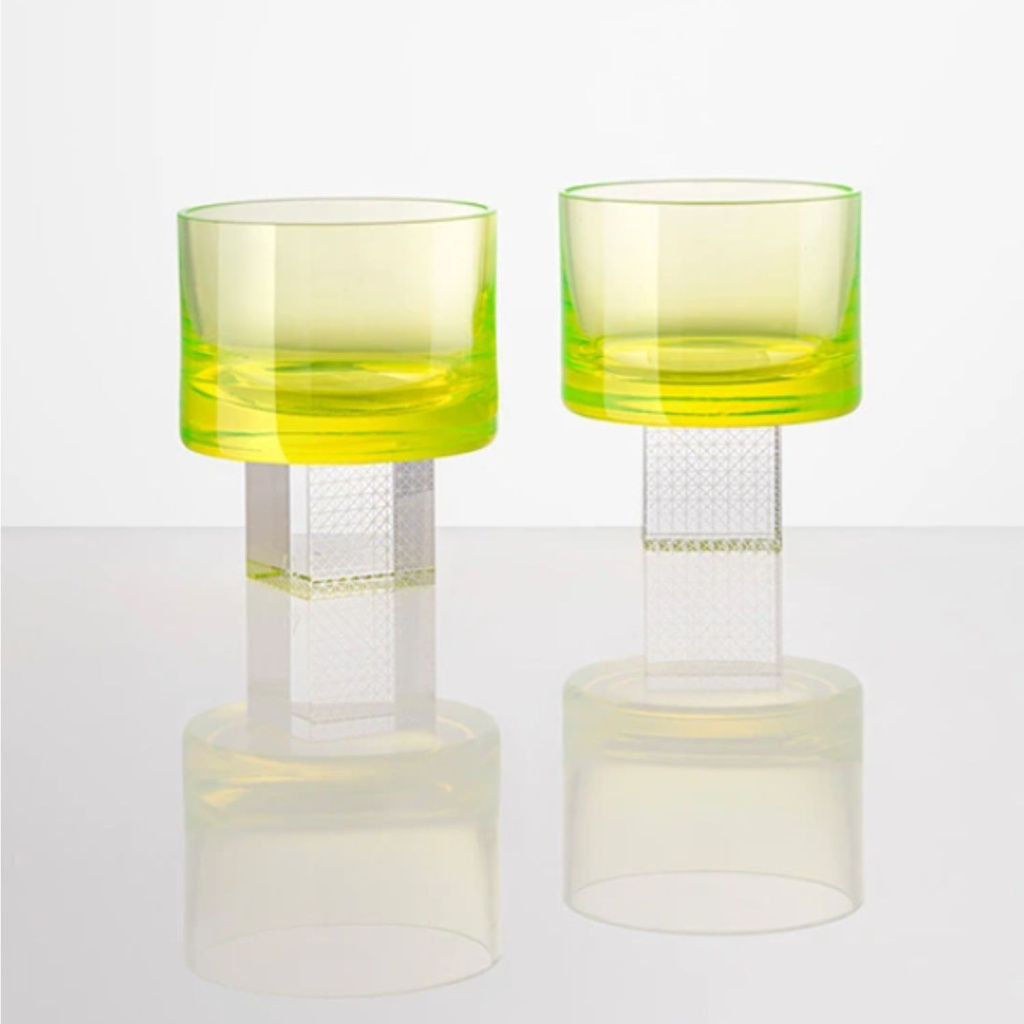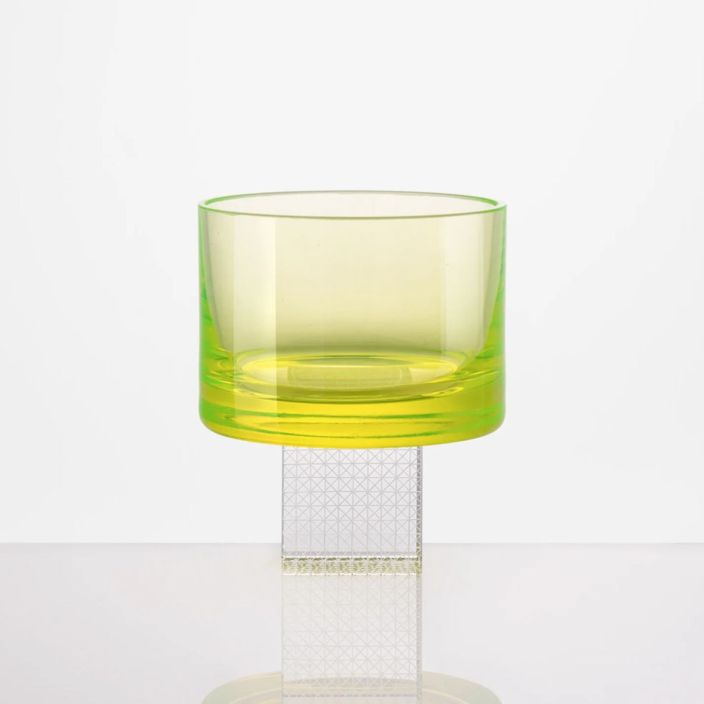 The glass is crafted from uranium glass—a material historically prized for its distinctive glow under UV light and delicate lime-green hue. Today, uranium glass is rare and coveted by collectors for its aesthetic and nostalgic qualities, adding both visual intrigue and historic reference to this design object.