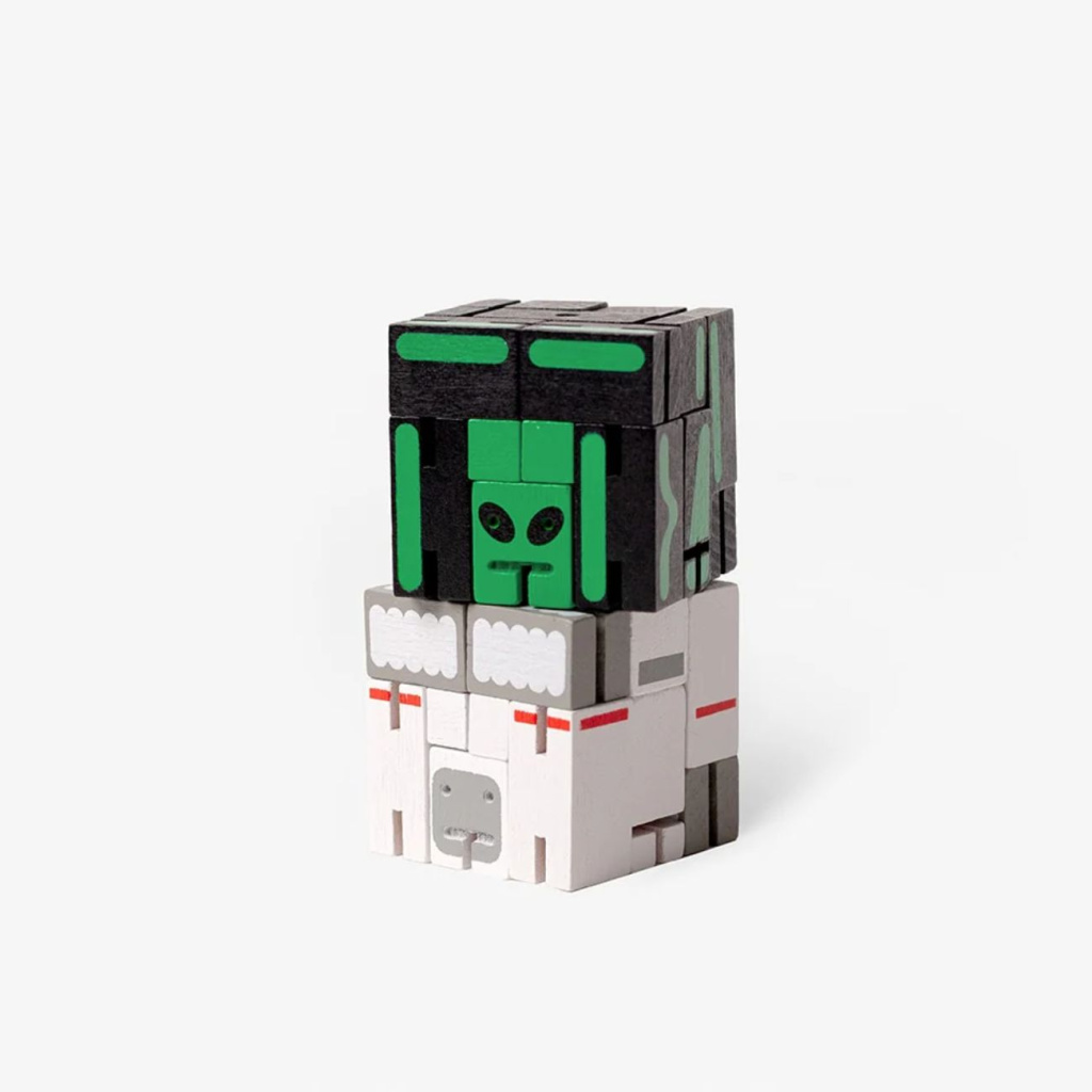 Each Cubebot is made from beech wood and inspired by the traditional Japanese toy kumi-ki. Its elastic joints allow it to transform from a compact cube into a poseable robot — and back again. Both charming and educational, perfect for ages 4 and up.