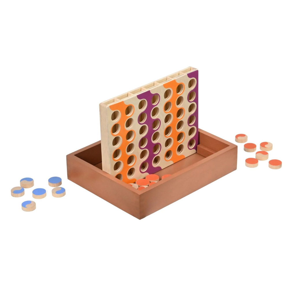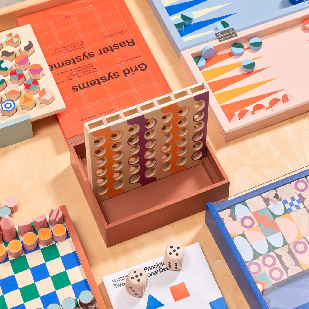 The Four in a Row game features a classic concept reimagined with vibrant op-art graphics. Two players take turns dropping their discs until one successfully lines up four matching symbols horizontally, vertically or diagonally. The colourful artwork on both the discs and the grid enhances the experience and adds a playful, modern visual identity.