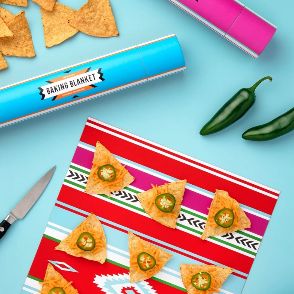 Bring vibrant colors and functionality to your kitchen with The Baking Blanket, a silicone liner inspired by classic Mexican textile patterns. This versatile mat offers a durable nonstick surface suitable for all your baking and roasting needs, including crispy nachos and more.