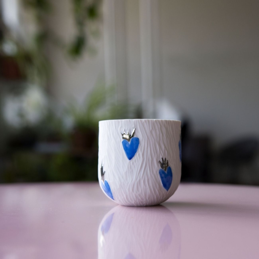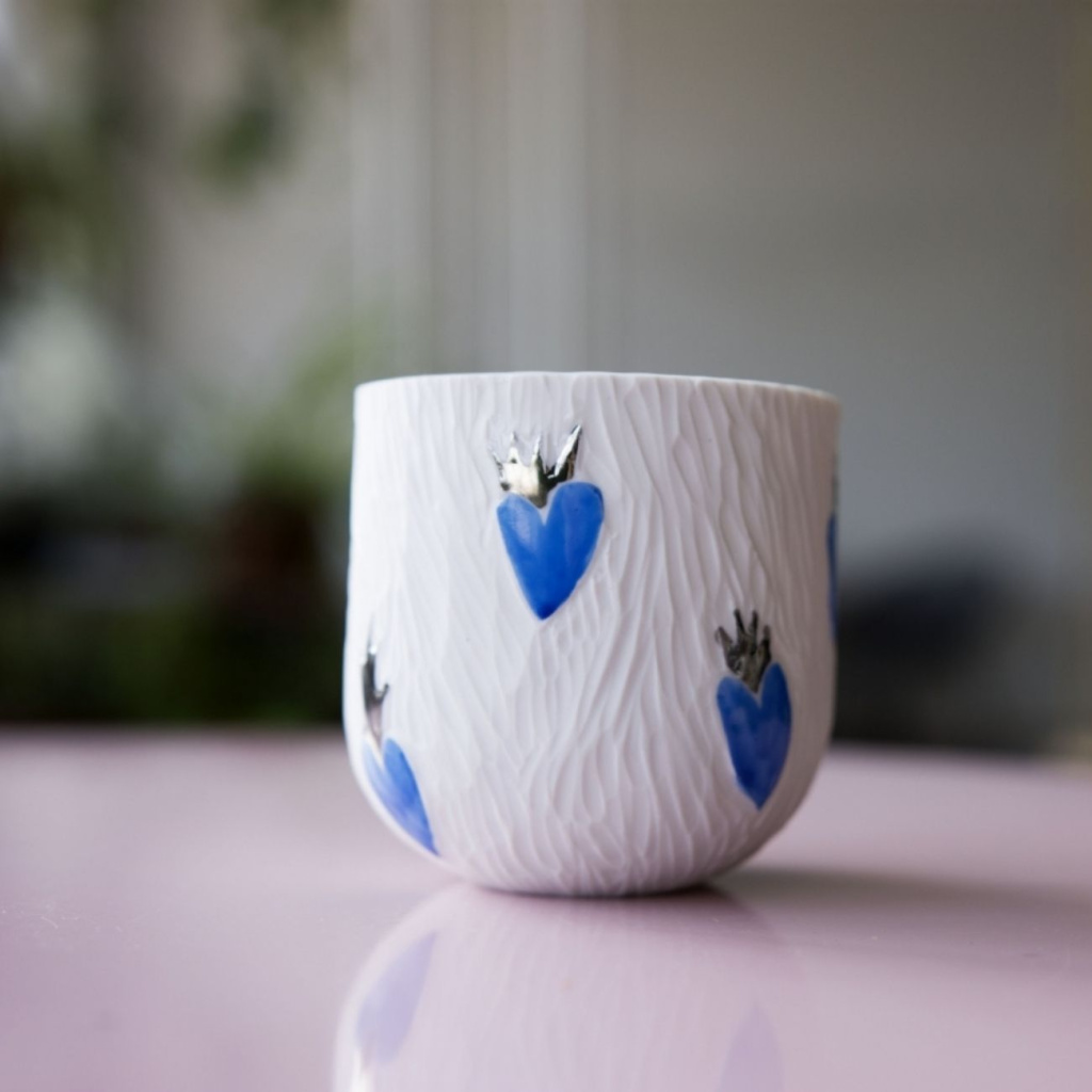 The Relic of the Hearth is not just a cappuccino cup—it’s a sculptural object crafted to enhance your daily coffee ritual. Handmade by Czech designer Pavla Vachunová of Tyformy, each piece is formed from high-quality porcelain and decorated with hand-painted blue detailing and a luminous 10% platinum finish.