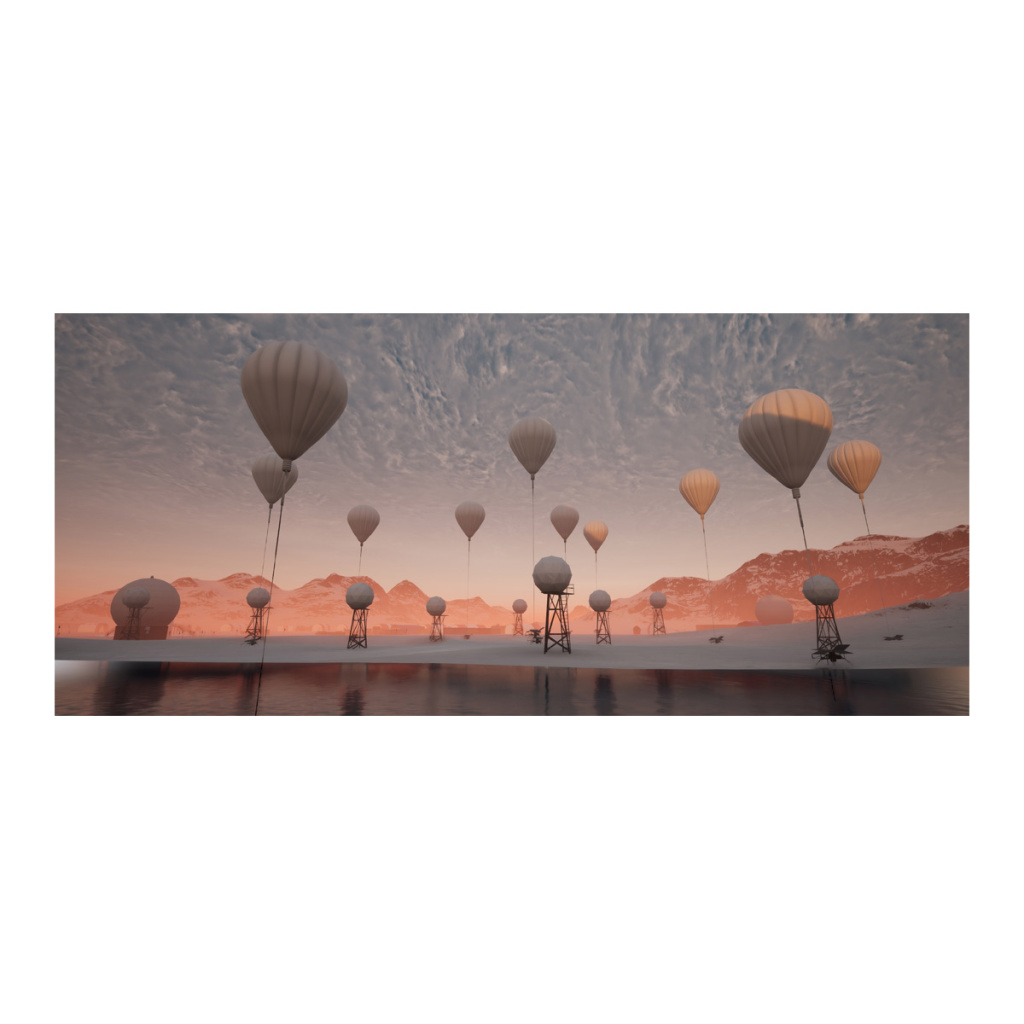 This print captures the atmosphere of Bucknell’s video work Staring at the Sun — a “documentary sci-fi” examining the shadow side of solar geoengineering. Through its striking visual composition, it conveys the tension between scientific progress and ecological uncertainty. The imagery blends scientific data, simulated landscapes, and speculative visual narratives, offering a reflection on how far humanity’s desire to control nature can reach.