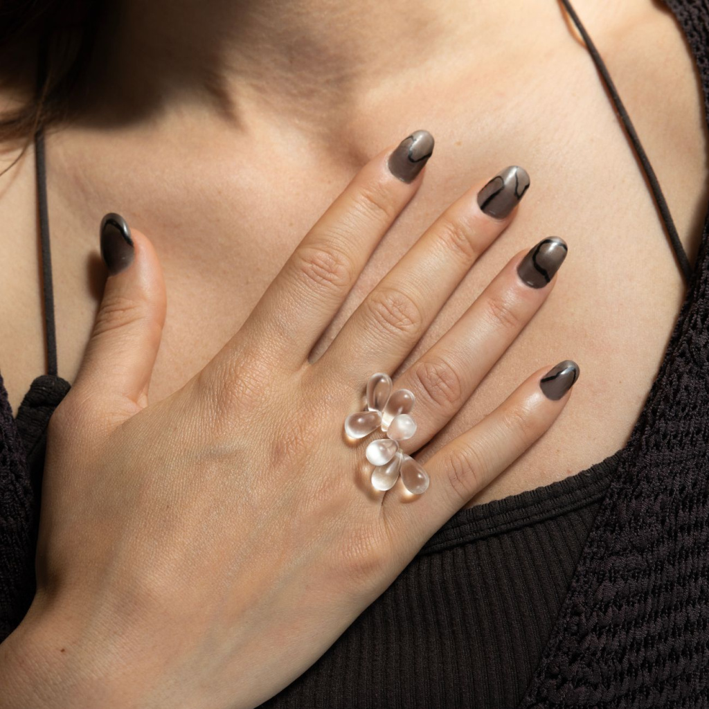 The HYDRA MATTE RING captures the calm beauty of mist in a sculptural form. Made from matte glass beads, each element diffuses light softly, creating a silky, almost ethereal appearance. The elastic nylon cord ensures a flexible fit, adapting naturally to the wearer’s hand throughout the day. Designed and handmade in Prague by Klára Dudáková – founder of Kaaret – this ring represents a mindful approach to design and sustainability. Kaaret’s philosophy is rooted in slow design, combining timeless aesthetics with repurposed materials such as deadstock, vintage, and secondhand components. HYDRA MATTE stands as the serene counterpart to HYDRA CLEAR – together they embody two facets of water: one translucent and dynamic, the other soft and contemplative. Each piece is crafted in small batches, ensuring its unique character and tactile charm.