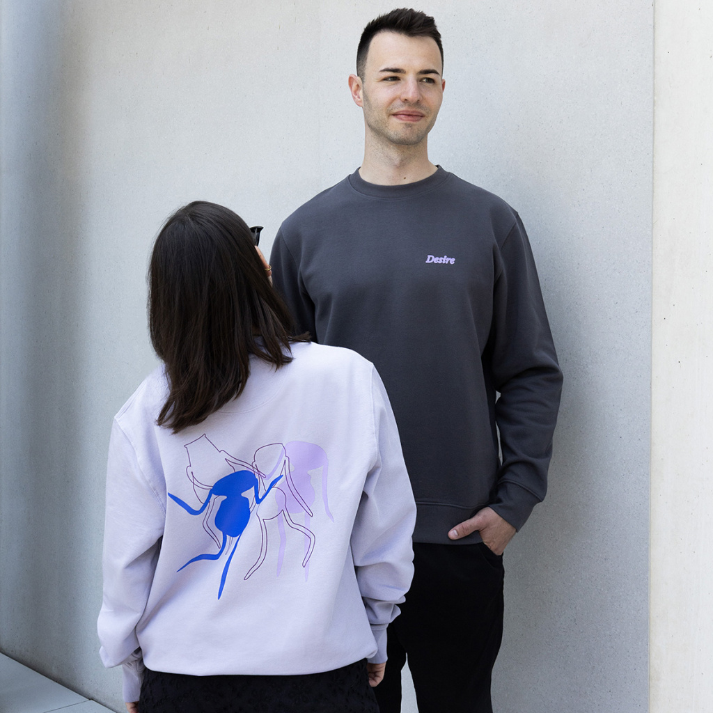 Looking for a well-fitting sweatshirt with an original screen print and high-quality material? The sweatshirt inspired by the Space of Desire exhibition by the artistic duo SHOTBY.US offers exactly that.