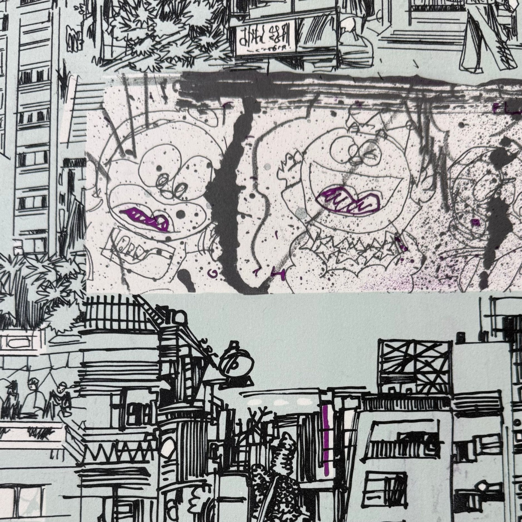 Do detailní kresby městských struktur vstupují tahy a syrové kresby, které odkazují k dynamice a neustálému pohybu městského prostředí. Dílo navazuje na Škapovu dlouhodobou tvorbu inspirovanou urbánní krajinou, graffiti a subkulturou, která ho formovala od 90. let.