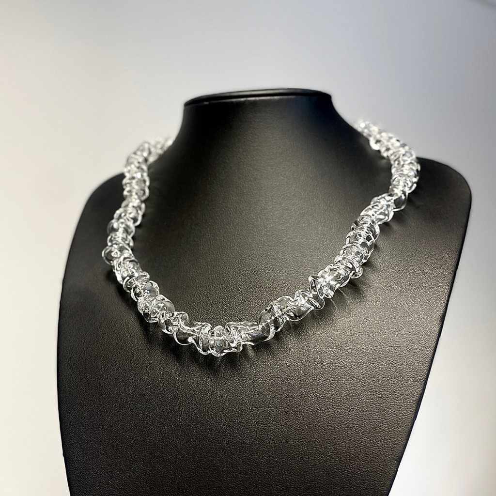 Autorský šperk z menší liberecké dílny, ručně vyrobený u kahanu a kroucený tak, aby vytvářel jedinečnou hru světla a stínu. Náhrdelník Wiggle kombinuje jemnost rampouchu z jizerské rosy s pevností chirurgické oceli, která je vhodná i pro alergiky.