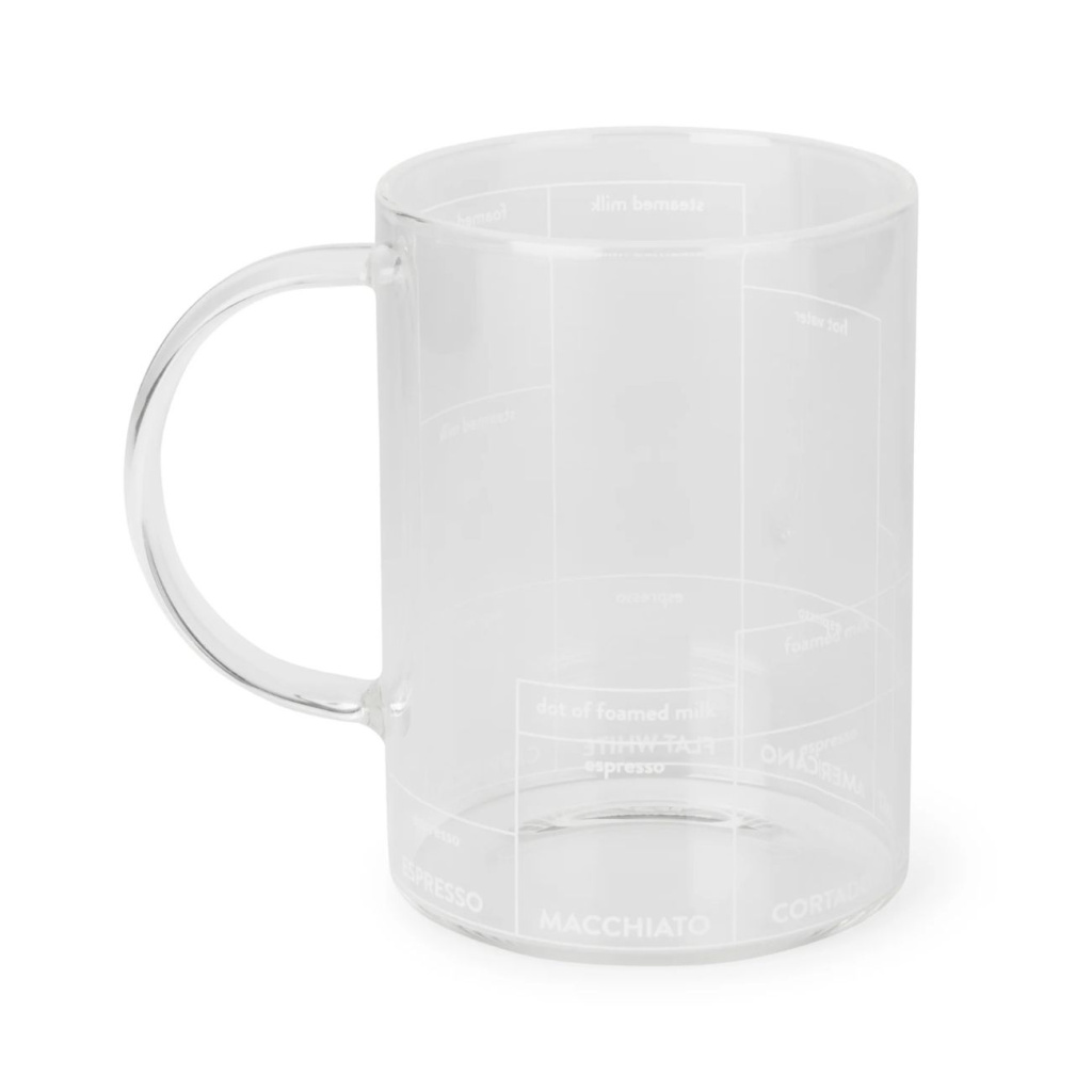 Recepty na hrnku zahrnují: espresso, macchiato, cortado, caffé au lait, americano, flat white a cappuccino. Hrnek je vyroben z odolného borosilikátového skla, díky čemuž zvládne i vyšší teploty a neabsorbuje chutě. Skvělý pomocník pro začátečníky i pokročilé milovníky kávy.