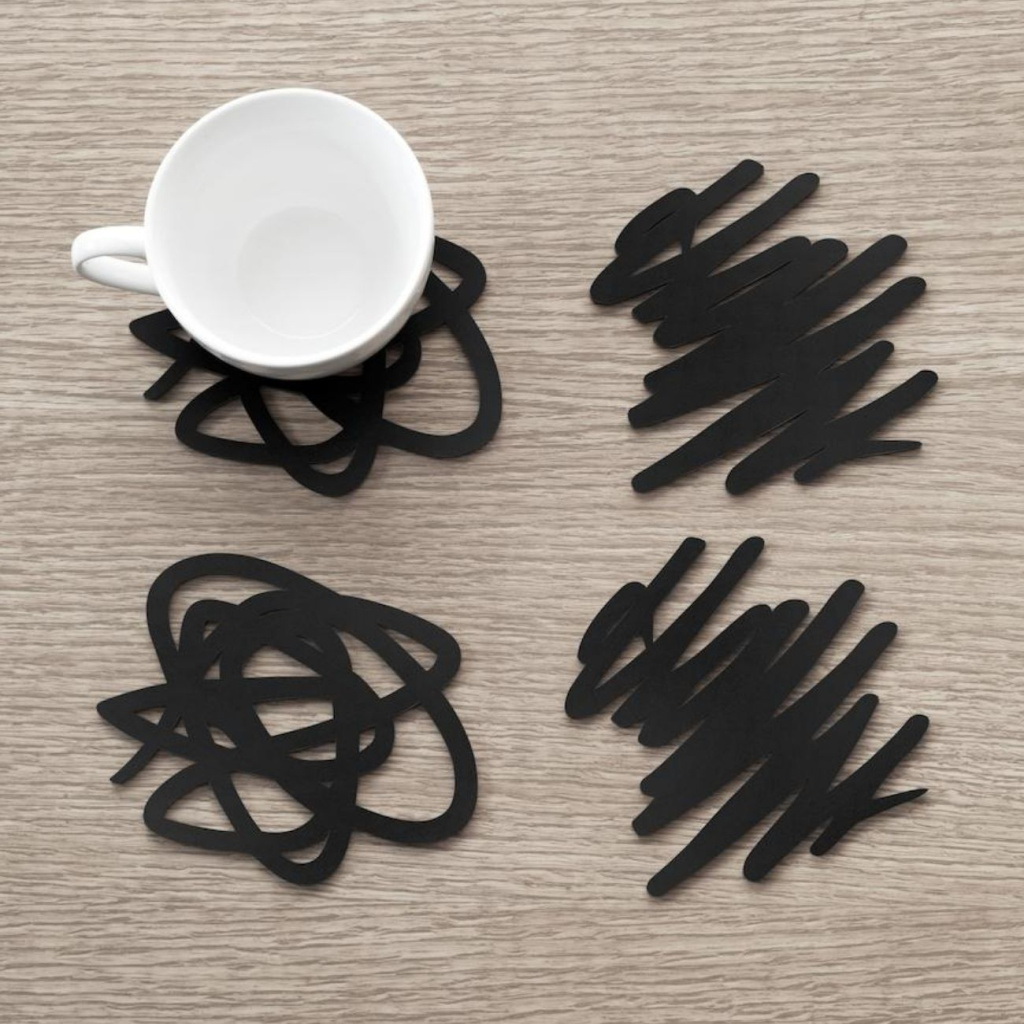 Sada čtyř silikonových podtácků napodobuje ručně kreslené linie – každý kus je jiný a přesto tvoří harmonický celek. Díky pružnému materiálu jsou odolné, snadno omyvatelné a překvapivě stabilní. Vznikají tak nejen praktické podložky pod hrnek, ale i předmět, který vyvolává zvědavost a úsměv.