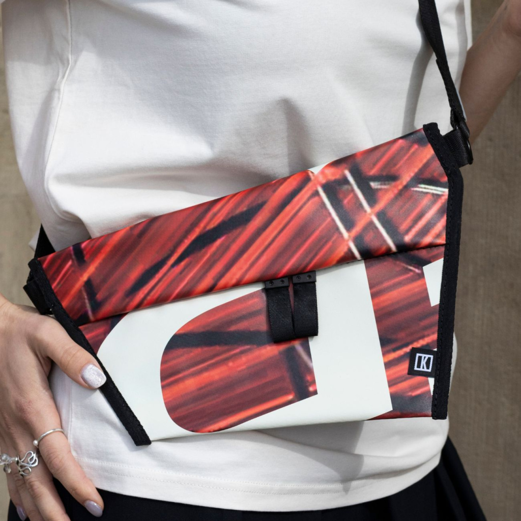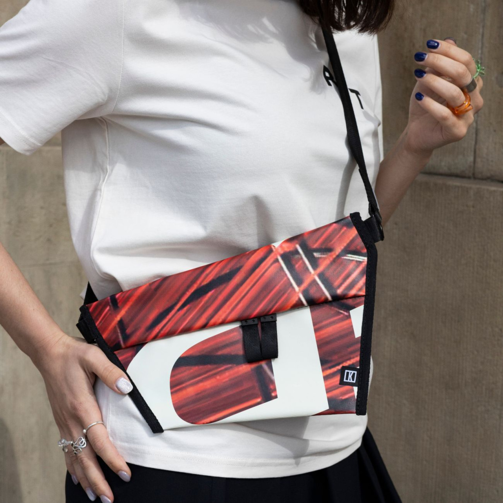 Každý kus je ručně vyroben v České republice a je naprosto jedinečný. Upcyklovaná PVC plachta je odolná, lehce omyvatelná a voděodolná. Minimalistický střih, nastavitelný popruh a chytré členění z ní dělají funkční městský doplněk s jasným postojem k udržitelnosti.